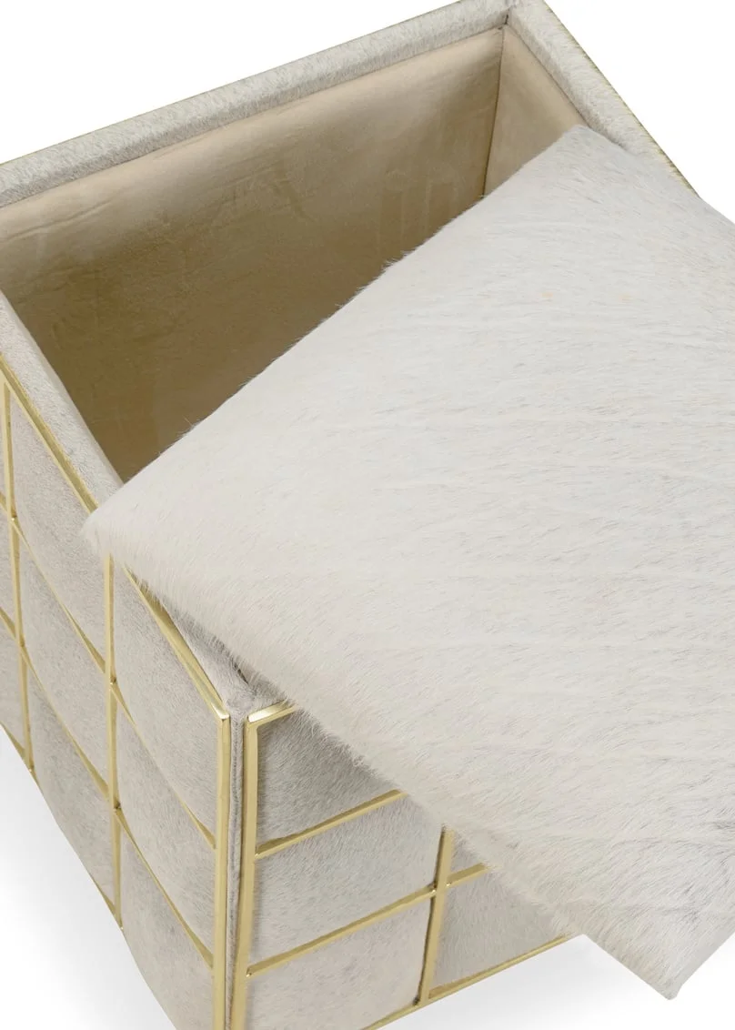 - The square hide ottoman has a brass square motif on light gray hair on hide.