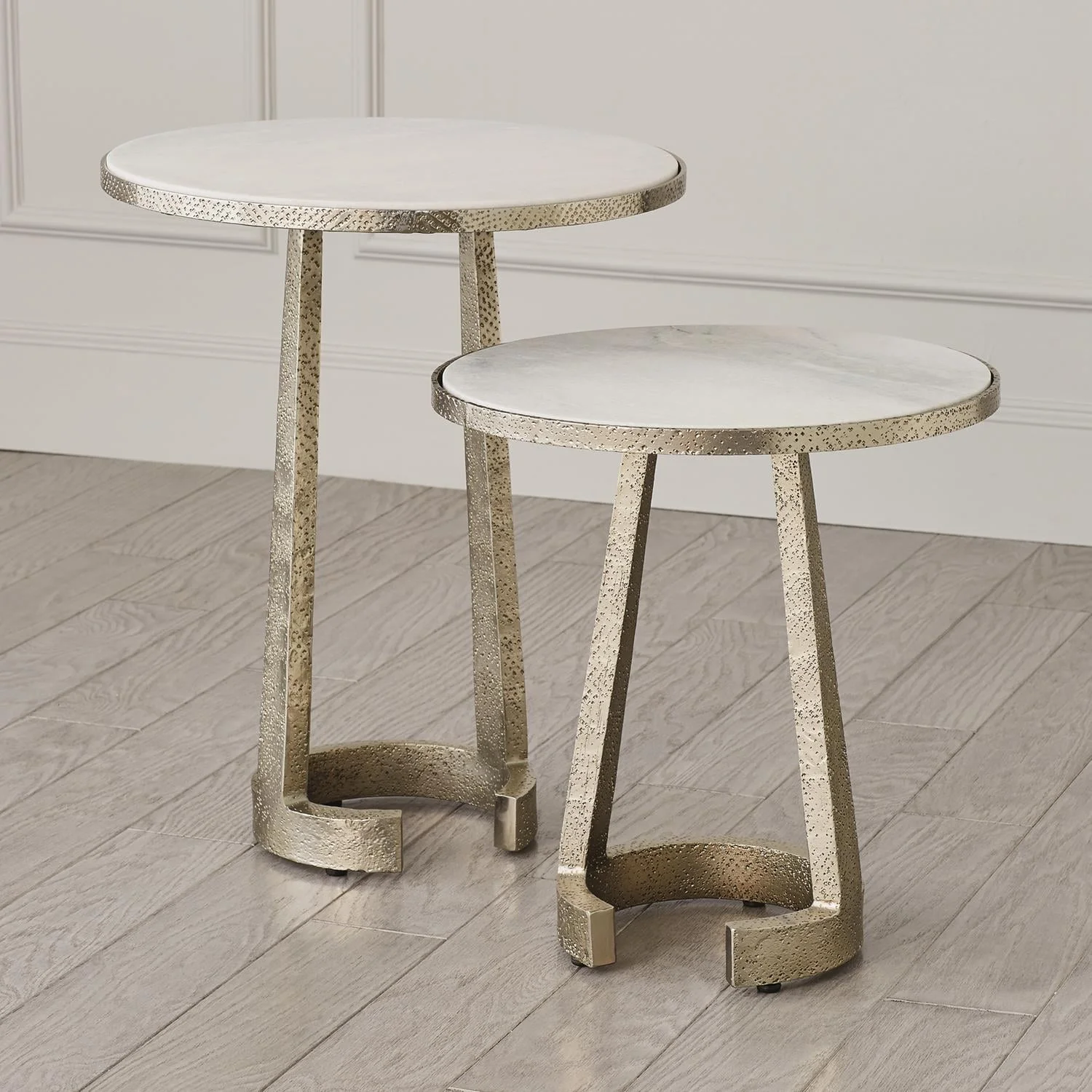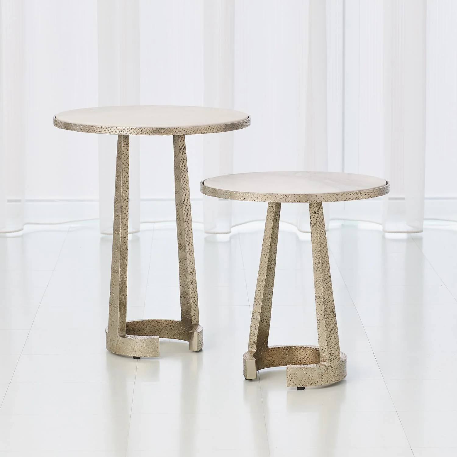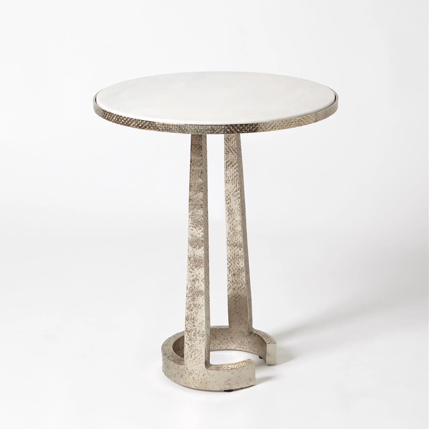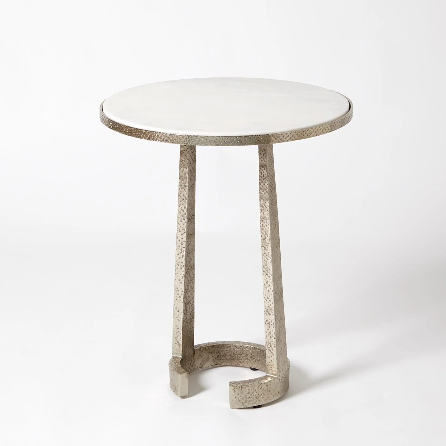 moreHammered legs with a nickel finish and a white marble top. The legs connect to the base shaped like a "C". Made in India. Available in two sizes.