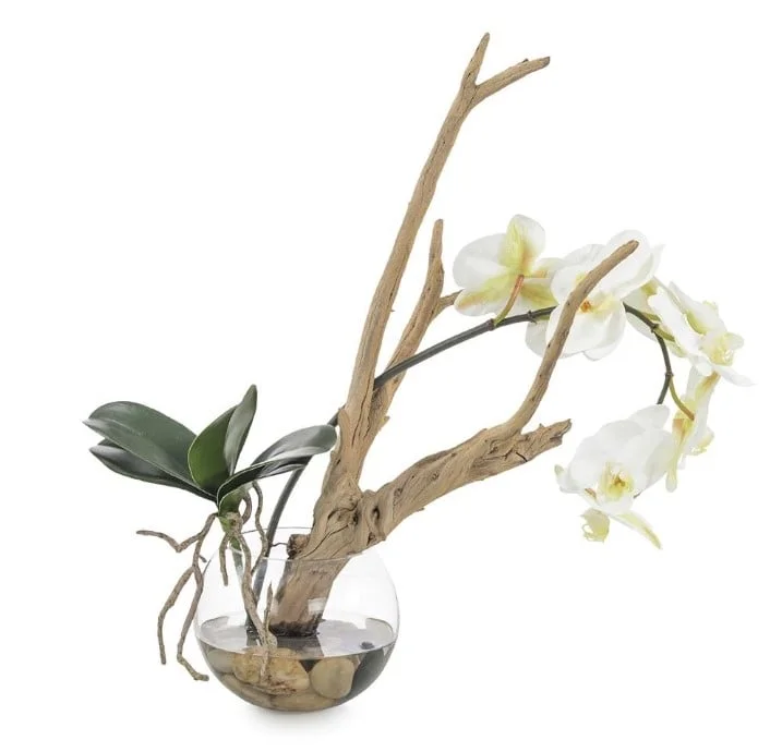California ghost wood, phalaenopsis orchid, foliage & natural river rocks in a clear glass bowl with faux water.