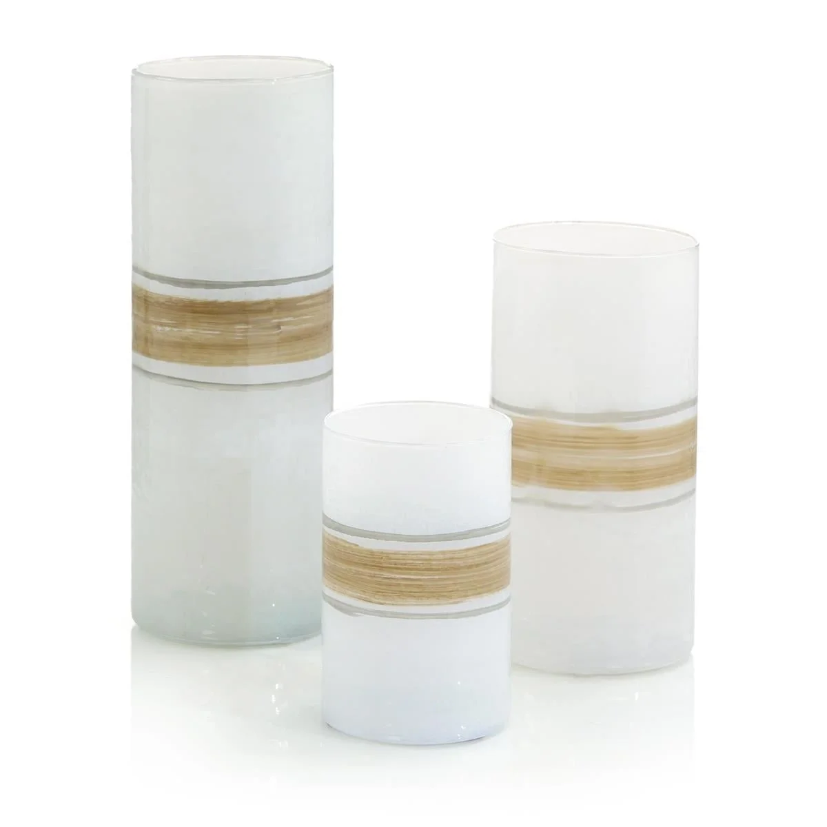 moreThis set of three frosted white glass cylinder vases are accented with bands of gold and gray.