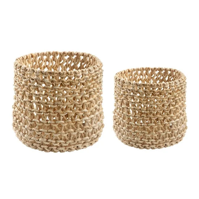 moreElevate your home décor with this exquisite set of artisanal baskets, combining beauty and functionality in perfect harmony. Each basket is meticulously handcrafted, showcasing delicate braiding techniques that ensure their durability and timeless appeal. Expertly woven by master artisans from Indonesia, these baskets feature sustainable abaca strands delicately wrapped around a sturdy iron frame. The use of this organic material adds a touch of natural texture and infuses your space with a organic essence. Welcome the warmth and artistry of these handwoven baskets into your home.