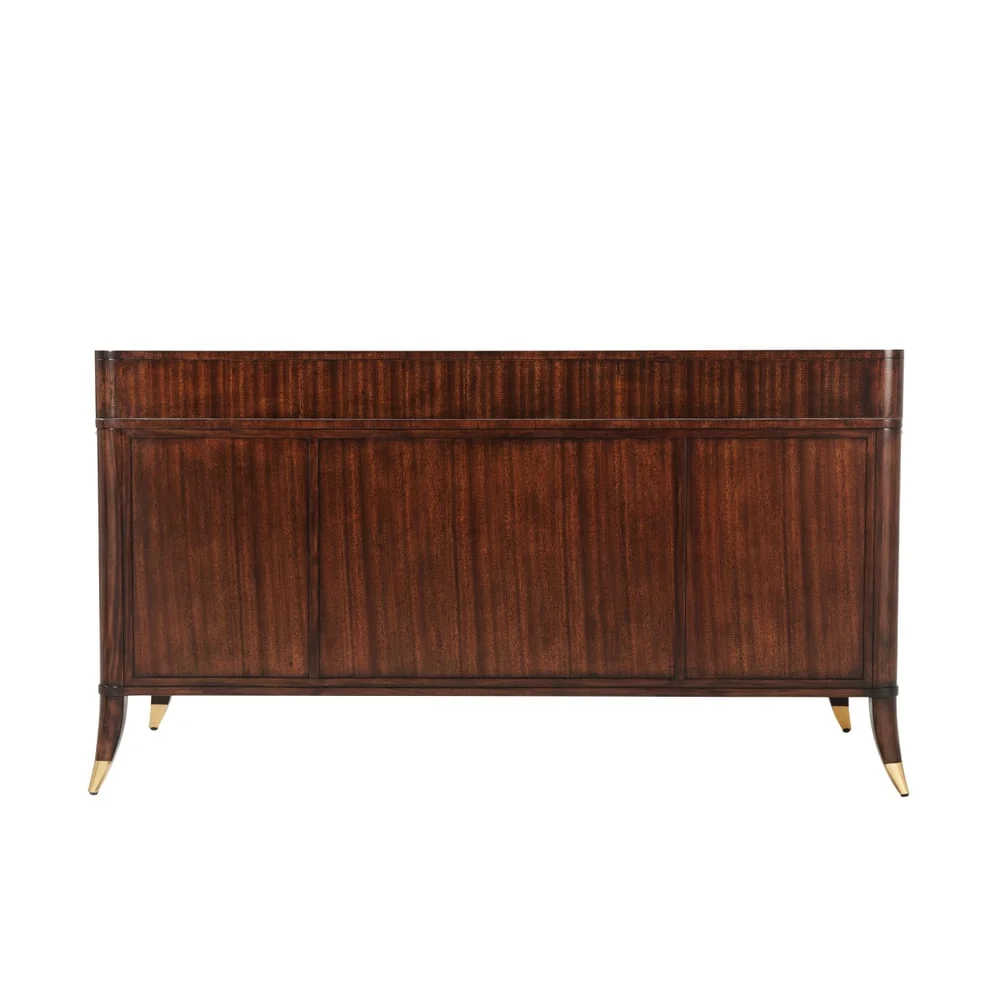 moreTrue to its French Moderne lineage, Gordon is a study in curves and angles. Two shapely filing drawers flank the kneehole. The desktop is ready to work with a two-drawer superstructure, and at the frieze, three drawers and two end slides. Set on splayed legs with brass cappings.
