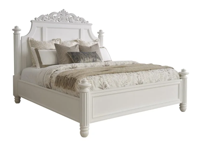 The Santorini bed features a crown on the headboard panel with pierced carving, which is removable. The generous bed posts and bun feet are fluted, and the posts are capped with spindle finials. The bed is also available as a headboard only.