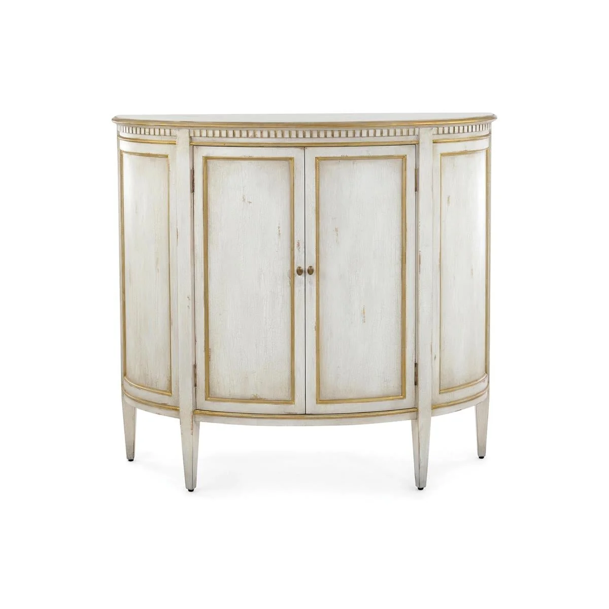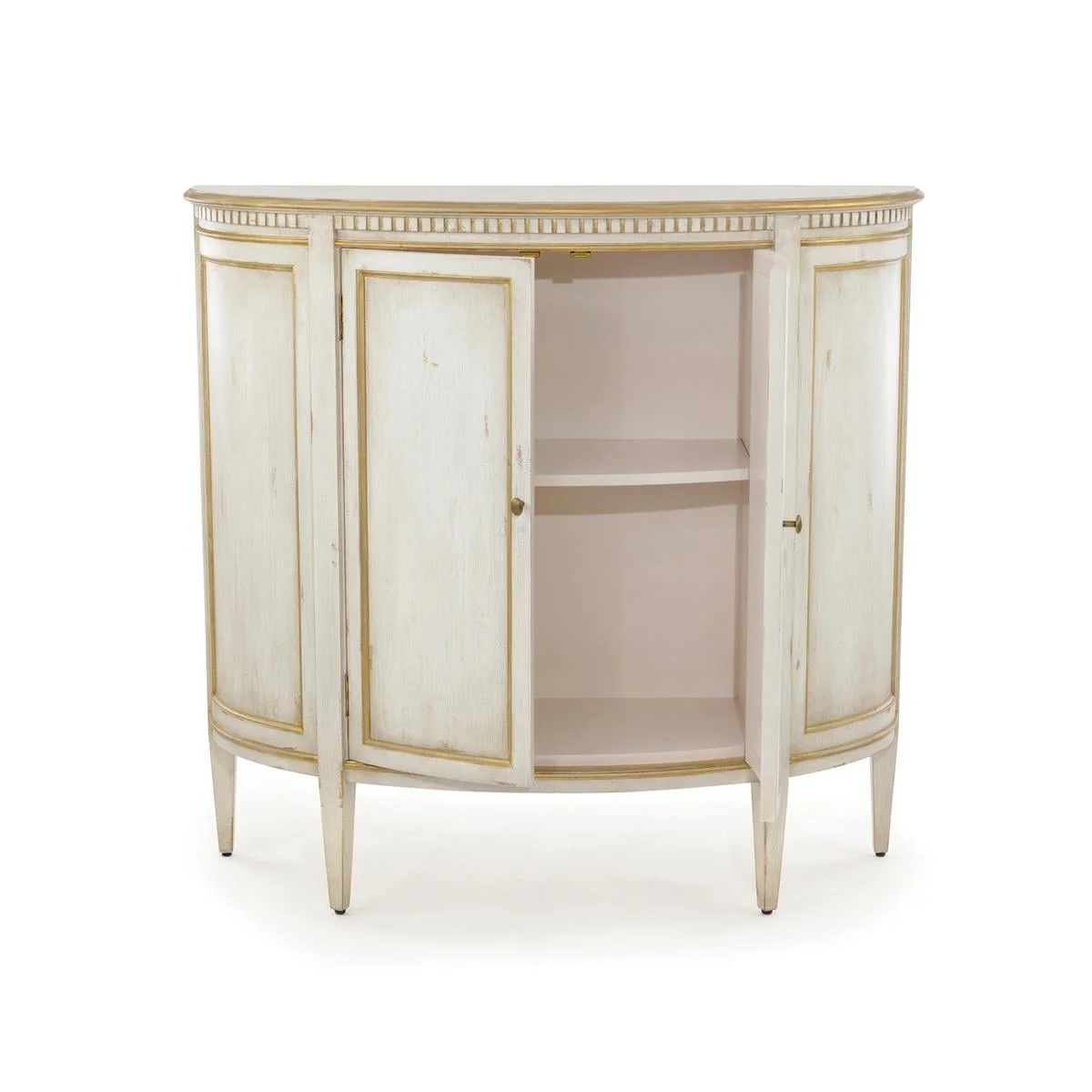 moreThe Volnay is a demilune cabinet in the French country style set on gently tapering legs. The finish is in distressed cream with gold detailing and an antique crackle effect. The case features dental molding under the ogee top. There are two paneled doors, each with a single antique brass knob and brass hinges.