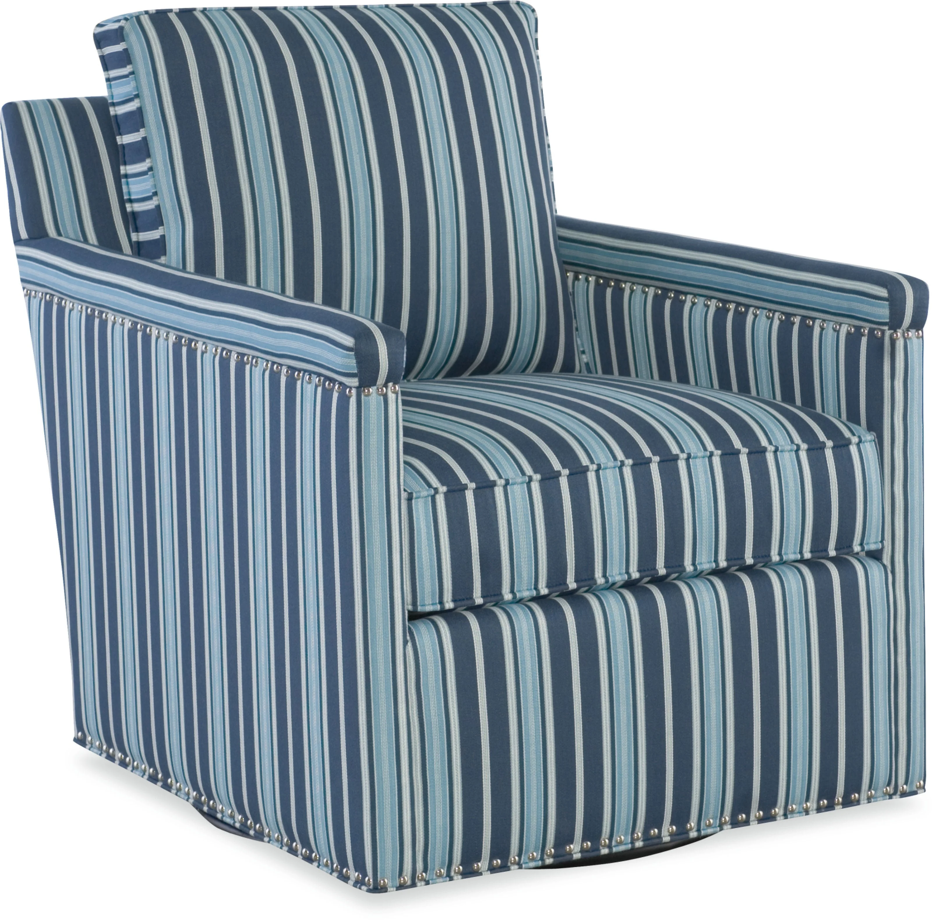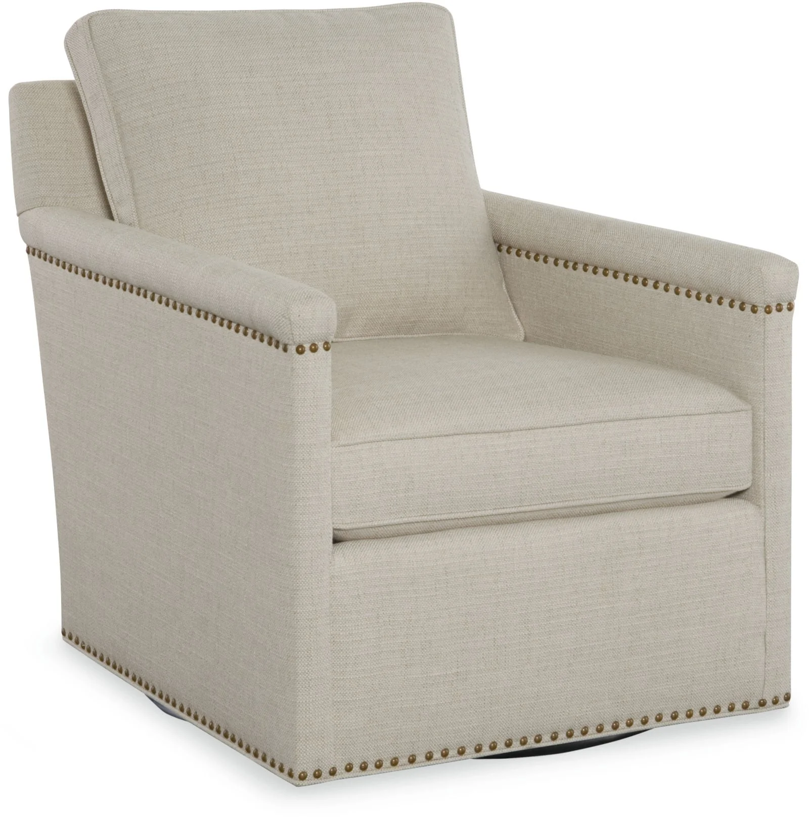 moreThe Brooklyn Swivel Chair shown in a Paxton Sand Body Fabric and a Small Brass Nail, Nailhead Trim around the base and arms.