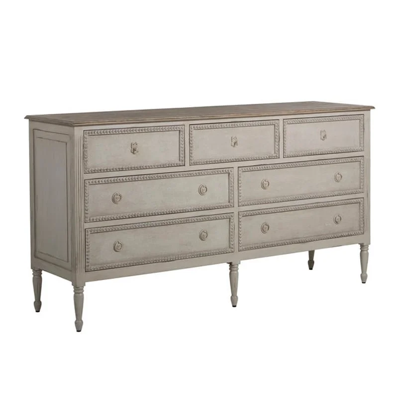 From the French style hardware to the textured white hand painted burlap on the drawer fronts, the Large Caroline Chest, inspired by formal dressing rooms of the 18th Century, features delicate beadwork, artfully carved legs, and wooden drawer glides. This coastal style large chest is hand finished in a layered antique white with inlaid fabric on the drawer front and a cerused wood top.