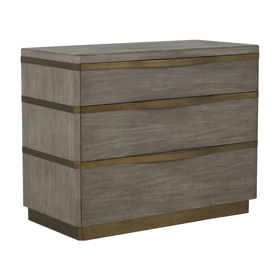 Slender metal bands wrapping the front and sides form unique drawer handles and give a modern vibe to this sleekly styled multipurpose chest. The faceted edges and refined gray-wash finish enhance the contemporary look of this piece, and the undermount soft-close drawer glides offer easy access to ample storage.