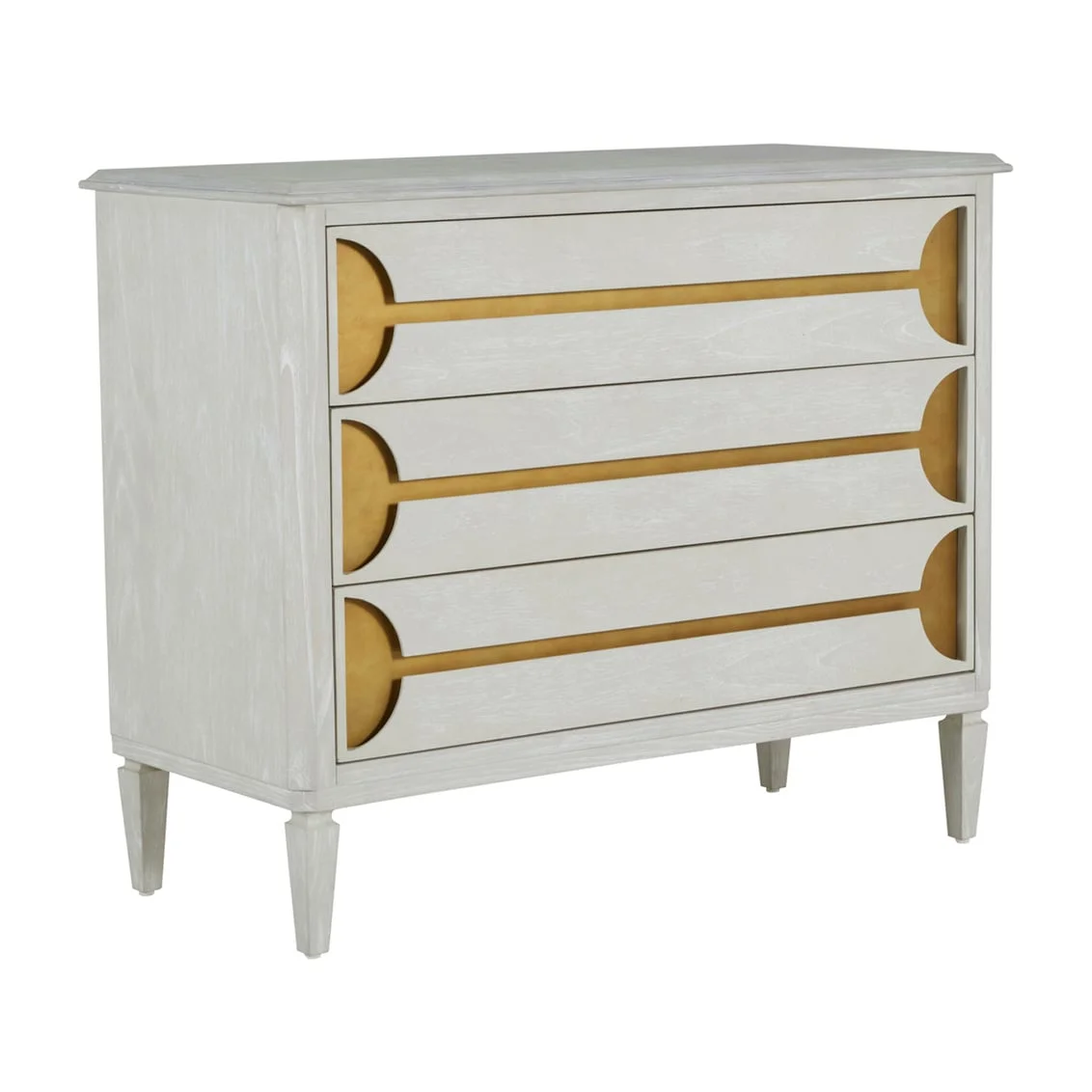 A traditional silhouette gets a fresh face with cutout-styled handles. A stained-gold finish behind the cutouts highlights the pattern and makes an appealing contrast against the Cerused White finish of the chest. Material: Mindy Wood Finishes: Cerused White, Stained Brass Size: 43.5 x 19.75 x 36.25"