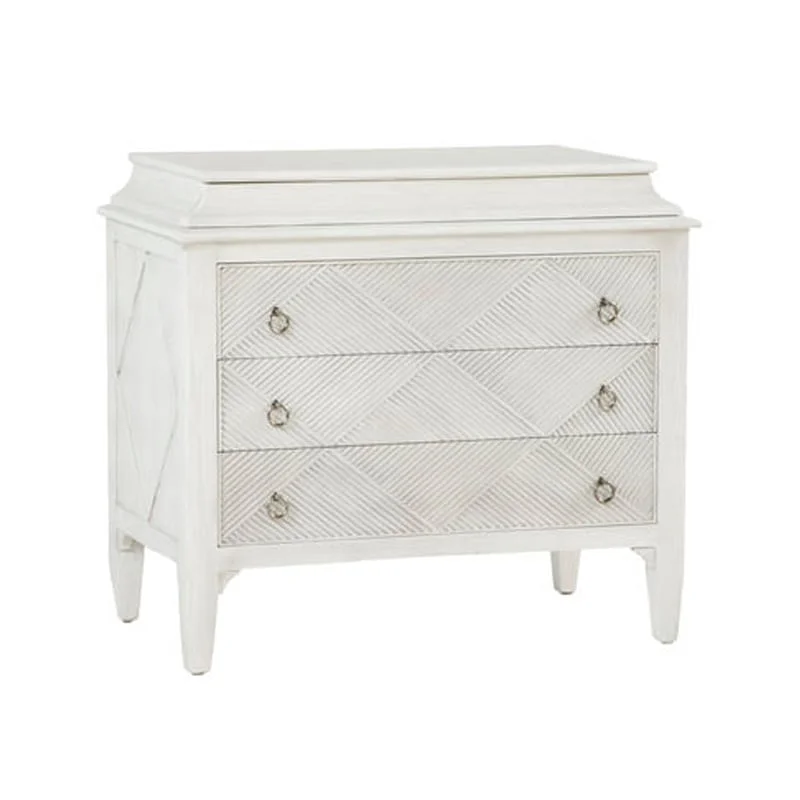 Made of porcelain white finished wood, the Marilyn Accent Chest is inspired by Swedish style. The carved grooves create a textured diamond motif that is integral in this vintage modern design. With a hidden drawer that slides under the table top.