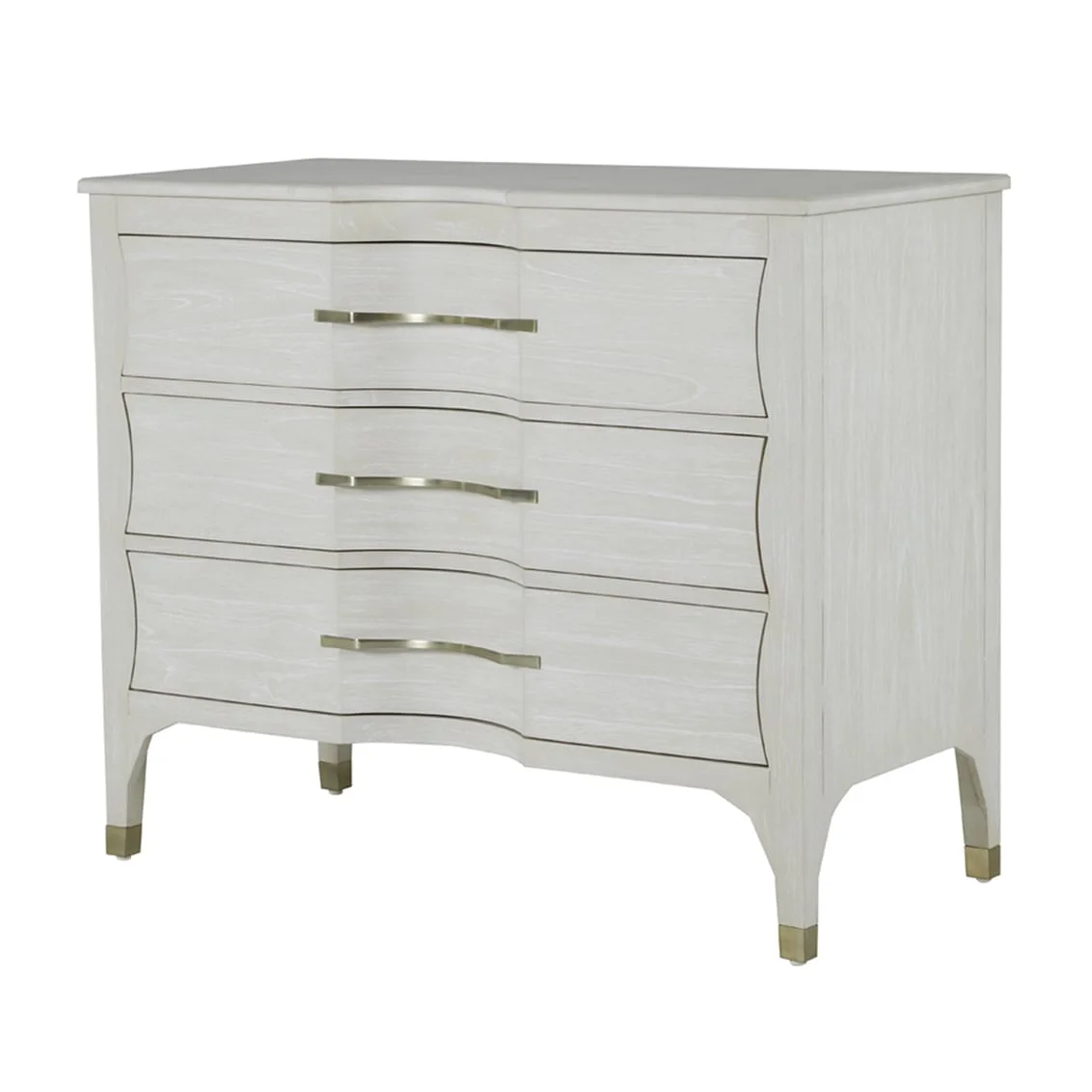 An updated version of the Spencer Chest, this chest features a lighter finish with simple hardware. A slight concave curve in the center front and curved drawers add a fresh look. Material: Mindy Wood Finishes: Cerused White, Stainless Gold Size: 42 x 20 x 35"