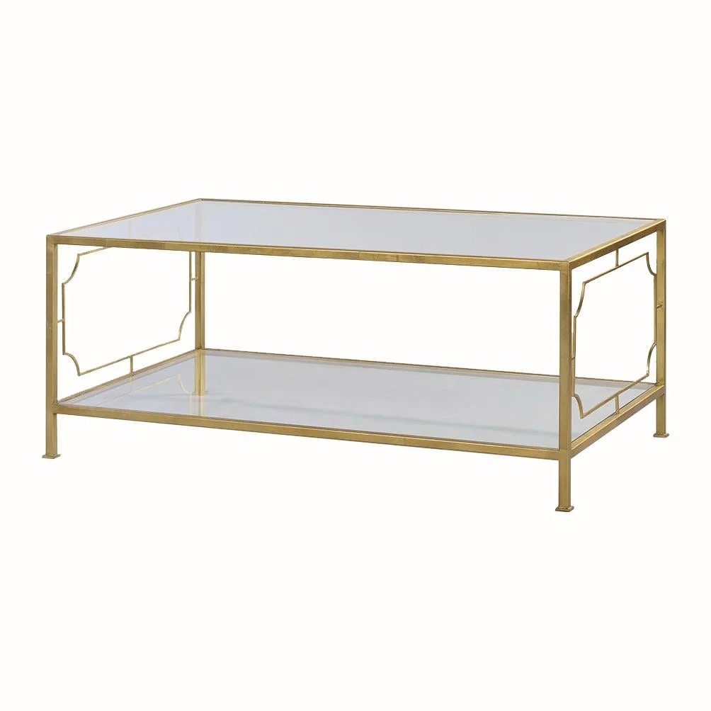 Rectangle coffee table with clear 8mm tempered glass top and shelf, metal frame, straight legs, and portrait frame detail on the table sides, has a fine “gold leaf” finish, slight glaze, and protective satin clear coat.
