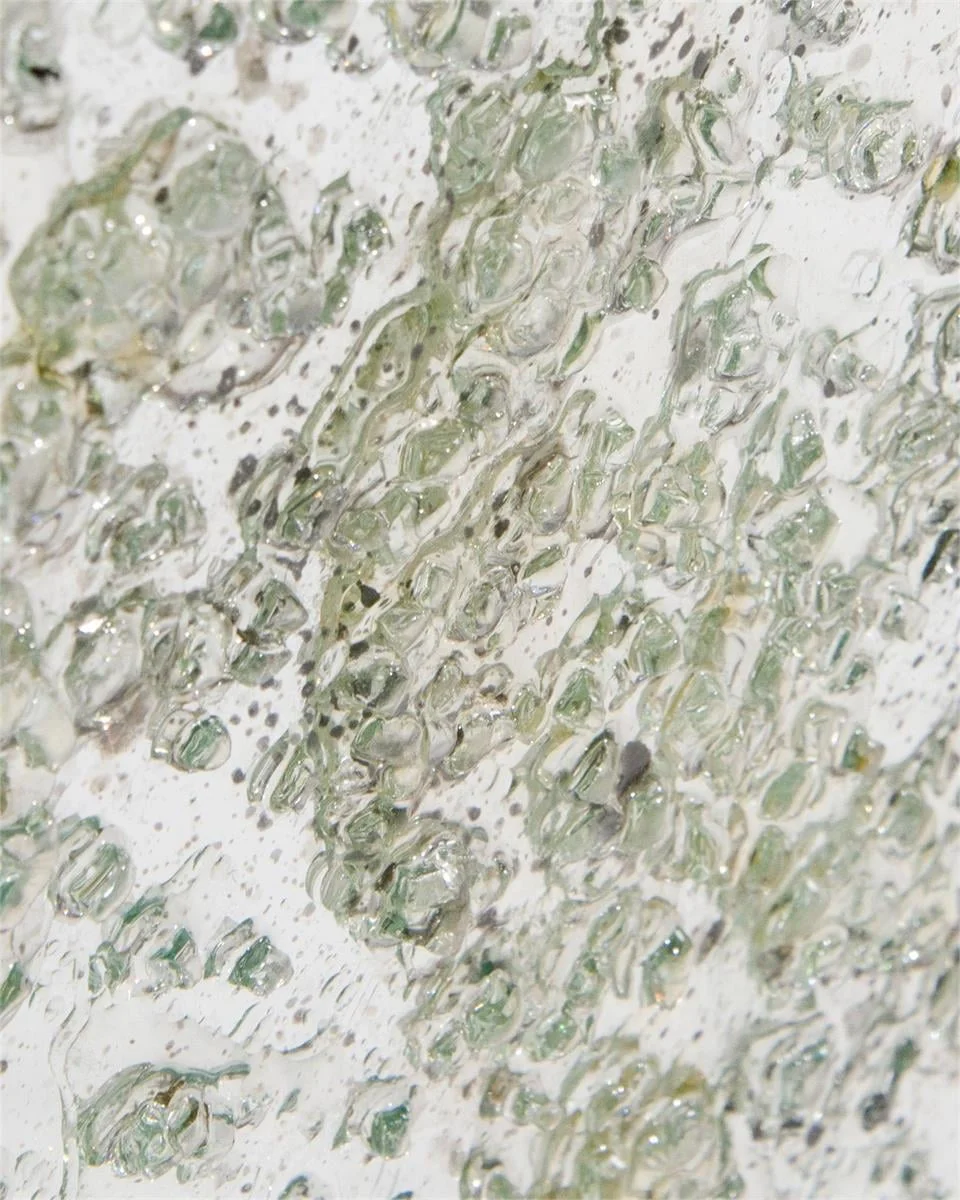 This four-door cabinet features broken glass embedded in a high-gloss vitreous finish made to resemble a waterfall.