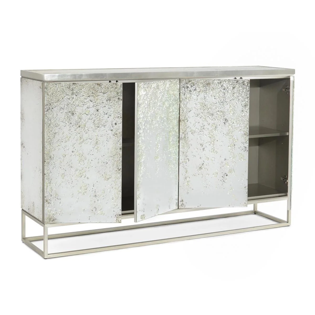 moreThis four-door cabinet features broken glass embedded in a high-gloss vitreous finish made to resemble a waterfall. It has a modern mirror top and sits on a steel base.