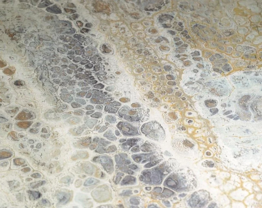 - The Mont-de-Marsan image by artist Shaye Rawson has been applied to the top and bottom shelf of this sofa table and covered in a hand-applied silver vitreous finish. The base and legs are done in a hand-finished gold.