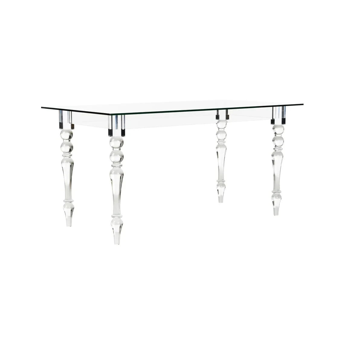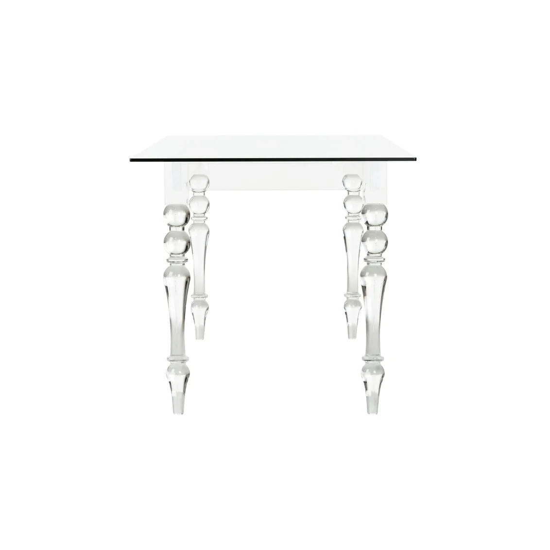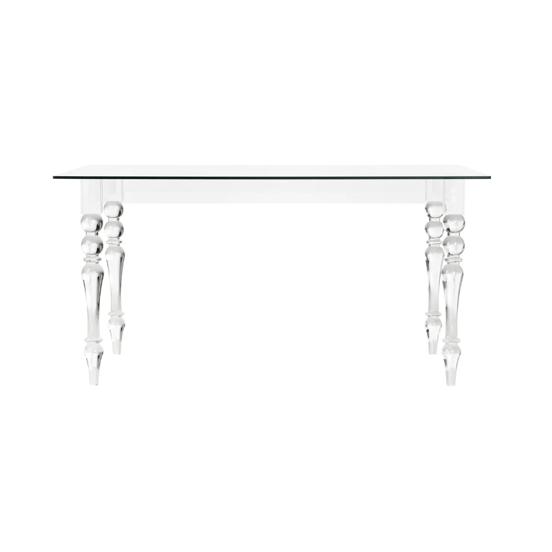 - Clean clear lines of acrylic, rounded fluted legs and a glass top highlight the neoclassical aesthetic of this piece which can be used as a desk or small dining table.