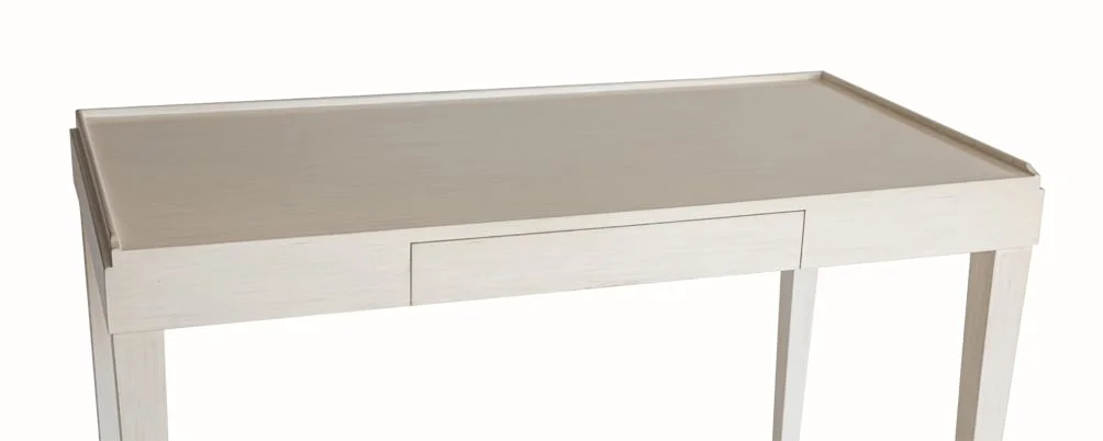 - Lip desk with tapered legs, hidden drawer and lipped top, has a “drift” white painted finish with subtle hand-painted grey detailing on Acacia crown veneer and Acacia solids.