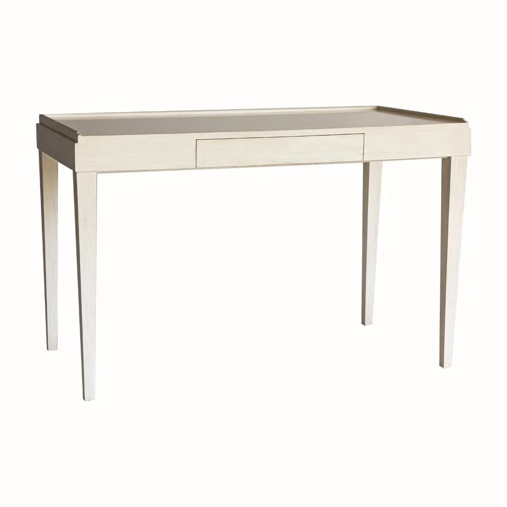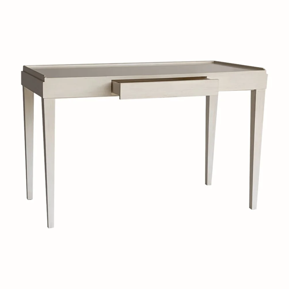 Lip desk with tapered legs, hidden drawer and lipped top, has a “drift” white painted finish with subtle hand-painted grey detailing on Acacia crown veneer and Acacia solids.
