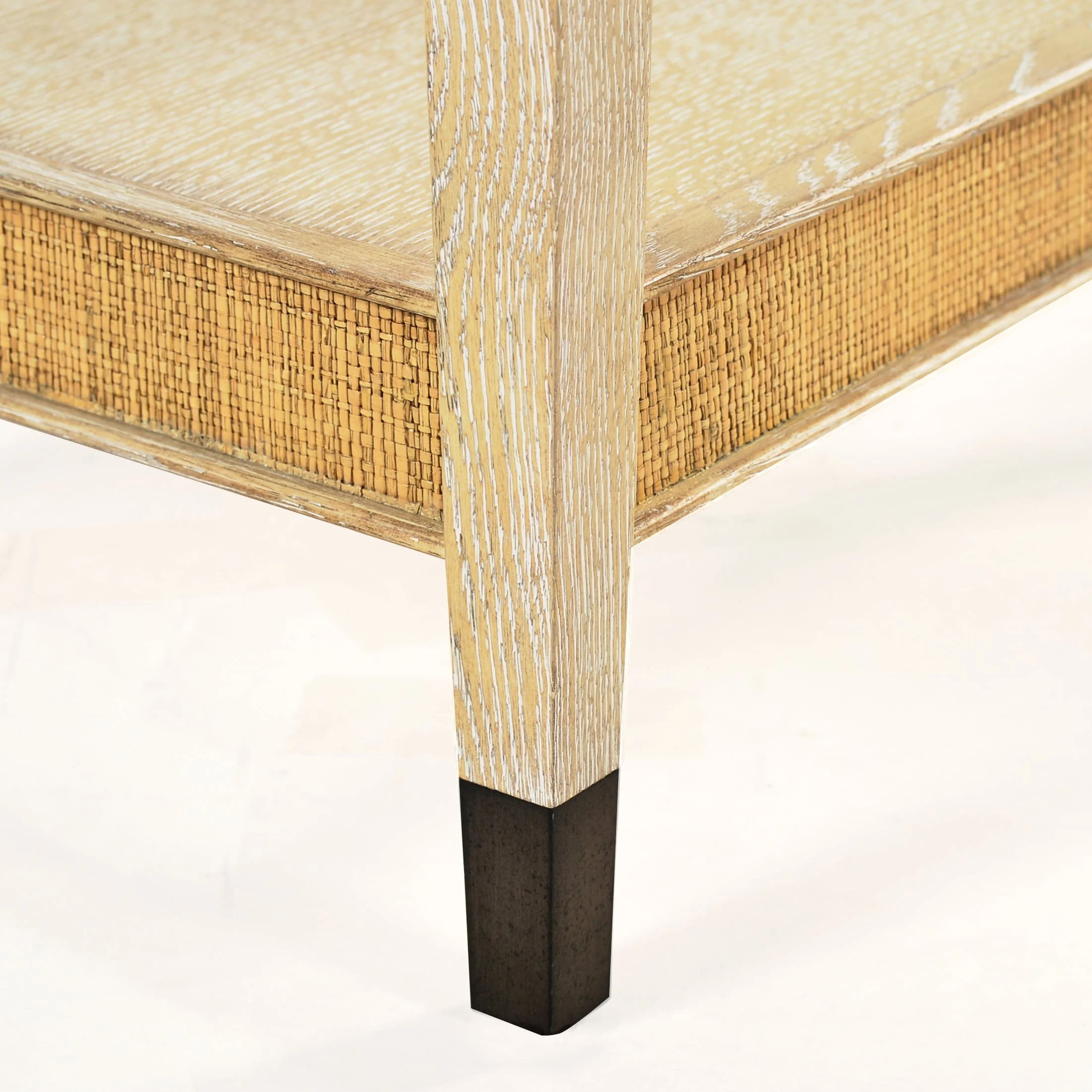 moreOur Carrick Side Table features a shaped top and apron, open shelving, tapered legs, slightly textured pewter finished ferrules, and a Raffia detail.