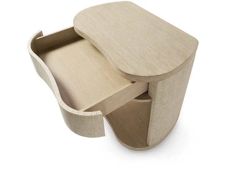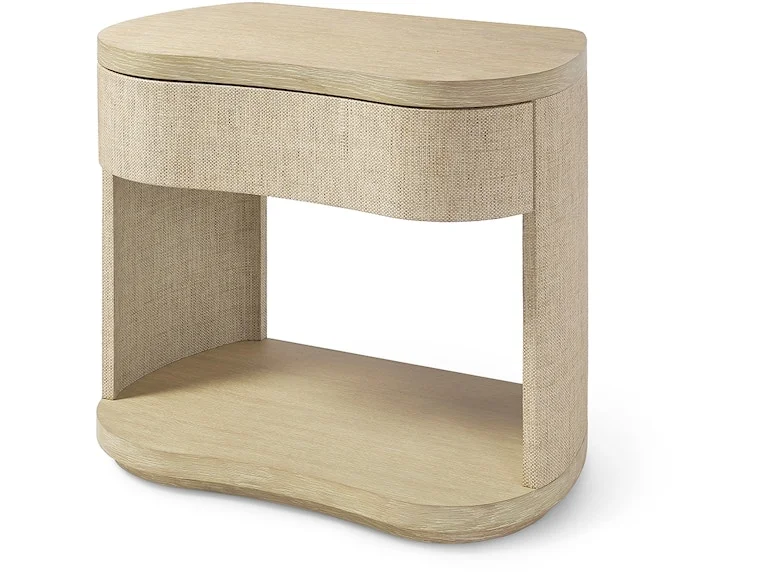 moreOak wood veneer laminated over an organic shaped hardwood top, base and inside drawer accented with grasscloth drawer front and inside and outside frame. Coordinates with the Hawthorne natural collection.