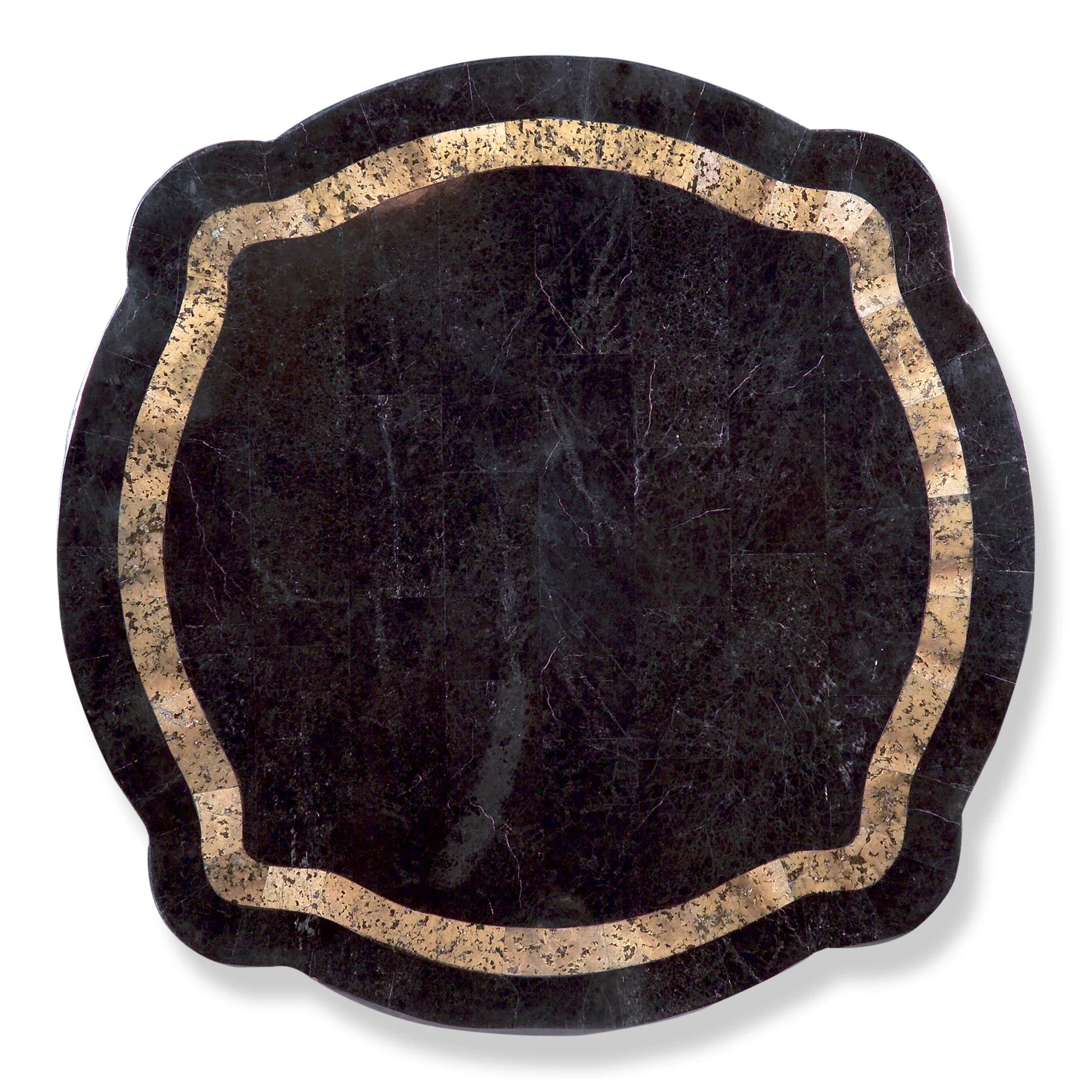 Made of select solid woods, wood products, resin components and choice veneers. Fossil stone veneer top with snakeskin fossil stone inlay border. Single drawer and one door with antique brass finished hardware. Center shelf behind door.