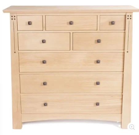 Unexpectedly modern, the Highlands Master Chest features eight drawers with square pyramidal pulls. Laser etching on the posts and pierced cutouts on the ends accentuate the look. The center drawer contains a sliding jewelry tray. Available in solid oak or cherry.