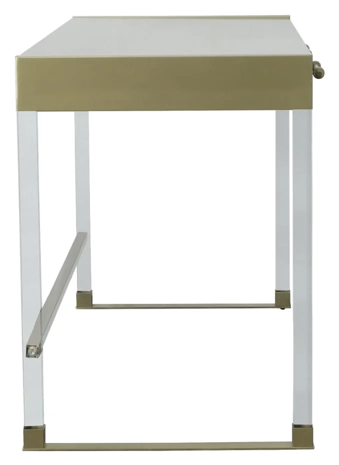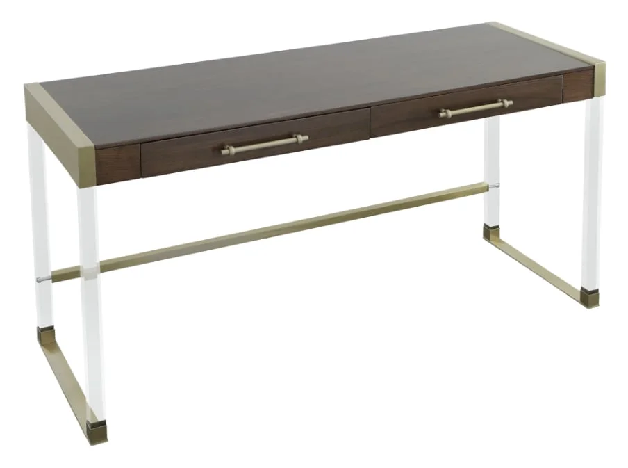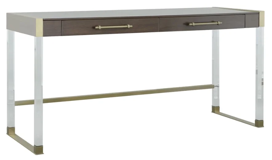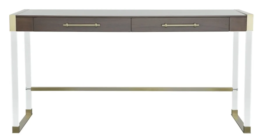 moreThis desk combines acrylic, wood, and brass to elevate the look of this piece by mixing materials. There's great contrast between the Smoked Stone wood finish and the subtle champagne brass metal detail and hardware. The plexi legs keep it feeling open and light and, because it's only 22" deep, it can easily work as a console or a desk, making it versatile and stylish.