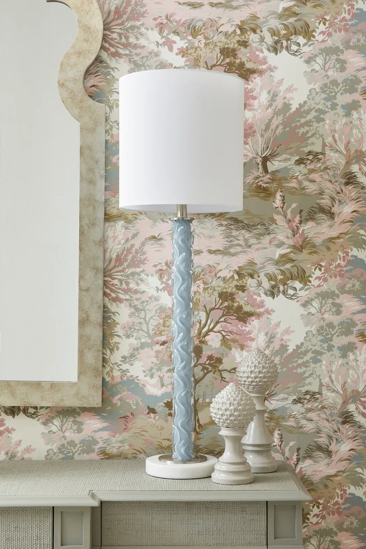 morePlayful and minimalist, the Emily Table Lamp has a gray and glass wavy three-dimensional pattern on its thin flute body and a white marble base, finished with a white shade.