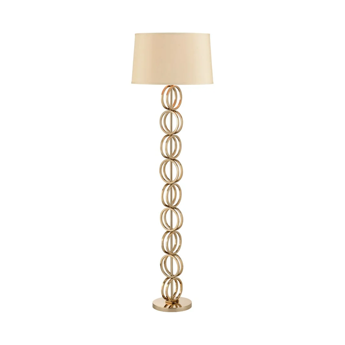 moreEnhance the warmth in your home with this transitional floor lamp. Crafted of stainless steel, this sturdy light has a sleek brass finish that will shine in any decor. Featuring a column of stacked circles with an exquisite champagne shade, in the ring floor lamp will brighten dim areas of your living area, bedroom or office.