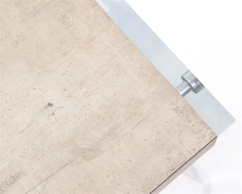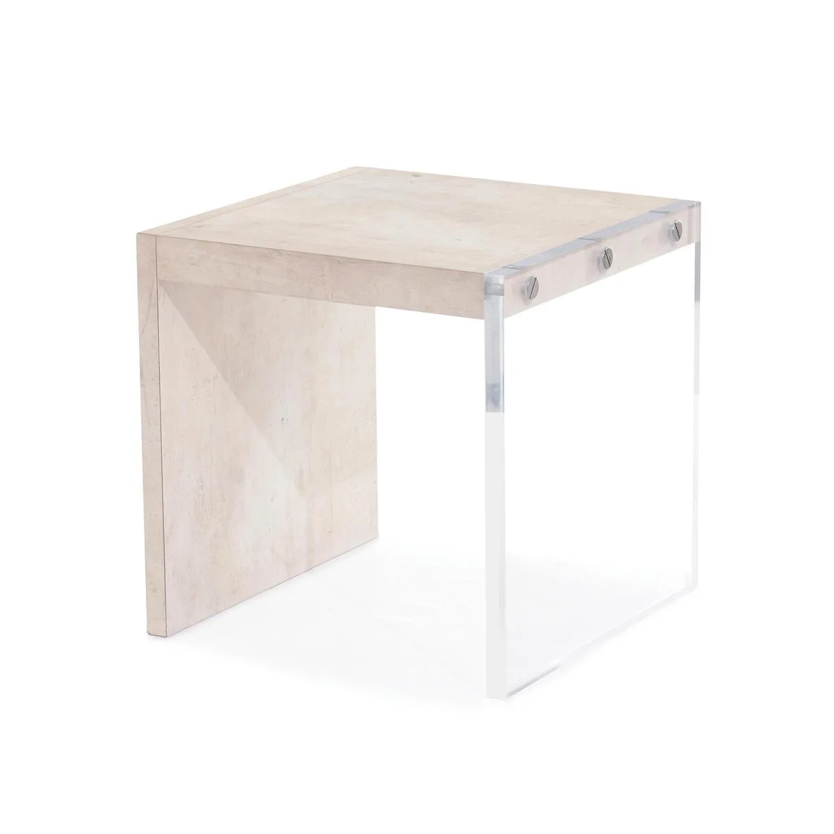 - This end table features an inverted L-shape in tiza gesso, with an acrylic leg attached by three decorative polished stainless steel screwheads.