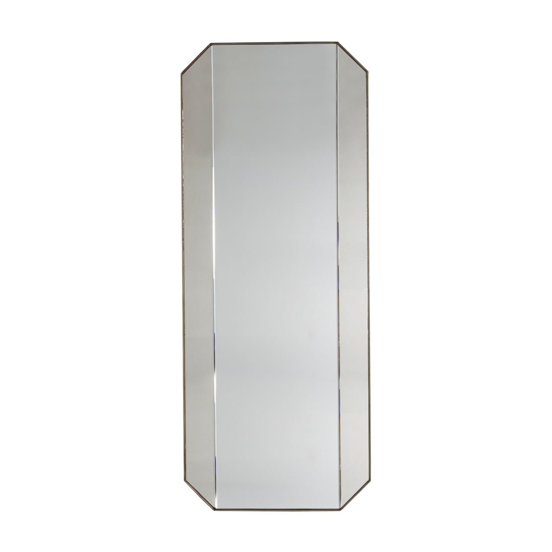 This octagonal mirror, framed in a textured champagne finish, features two antiqued side mirrors flanking a clear mirror. The ultimate in versatility, the mirror can be hung vertically or horizontally and is both practical and decorative. This 60" mirror works well hung on either side of a bed or as an accent in an entryway or living room.