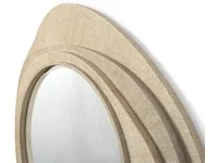 moreBeveled mirror set in natural oak wood trim and hardwood frame featuring alternating layers of hand-applied natural raffia and oak veneer. Wall decor comes with a metal hanger for mounting.