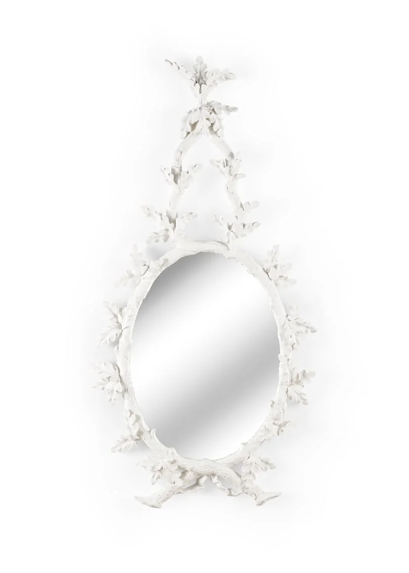 Elegant oak leaves hang from intertwined branches creating this stunning mirror. Oakmont mirror is crafted of composite with a matte white finish and features an oval mirror. Hang over a console in your foyer or accent table in your dining room to reflect your design style. (Also available in gold leaf finish.)