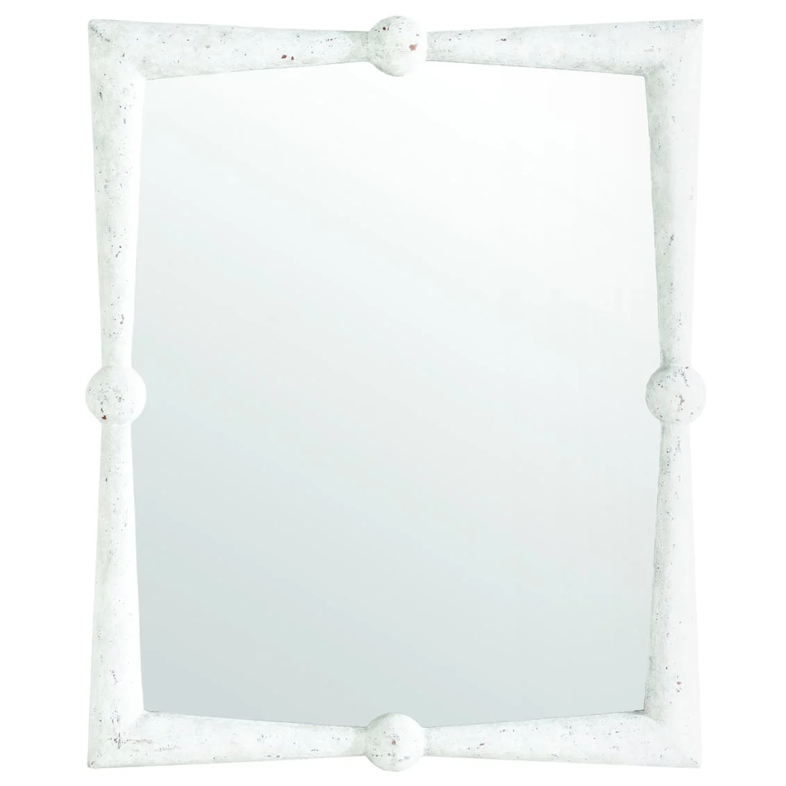 The oversized rectangular frame of the Scarlett Mirror creates visual interest with a rounded angular motif and sphere details. This large accent mirror is finished in a neutral antique white.