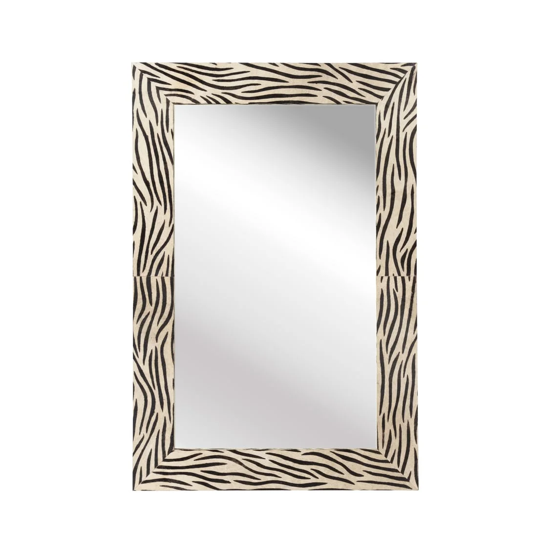 Add texture and exotic flare to your bedroom or living area with this genuine hide on hair mirror. Featuring a black and white zebra pattern, this rectangular wall mirror will pop in a monochromatic or contemporary decor. Mirror comes ready to hang in either a vertical or horizontal position.