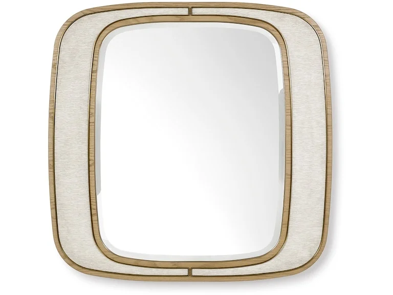 moreBeveled mirror set in an oak wood veneer frame accented with antique brass finished metal trim featuring inlaid grasscloth.