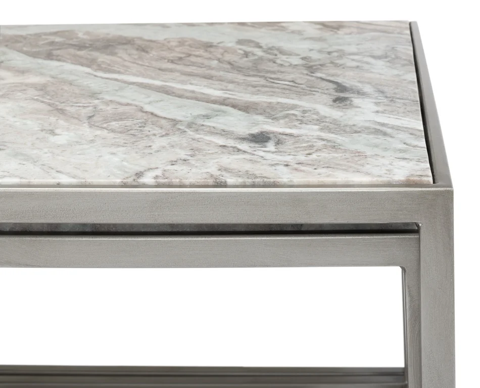 moreA very popular item, this set of 3 nesting tables has iron frames in a Silver antique finish. Beautiful marble with grey/taupe coloration.