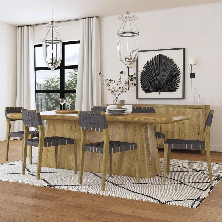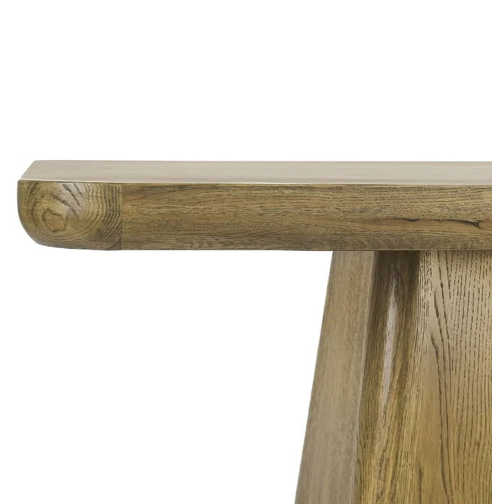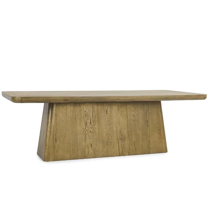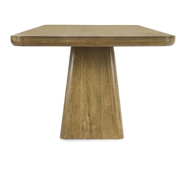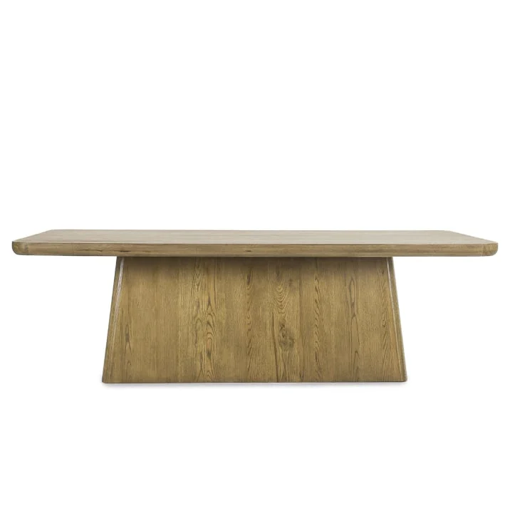 moreWith Beveled corners and an angled pedestal base, the Orlando 95” Dining Table in light brown amplifies an oaky aesthetic through bold, modern design. Made from solid oak and oak veneer, the table is durable, sturdy and capable of seating up to 6.