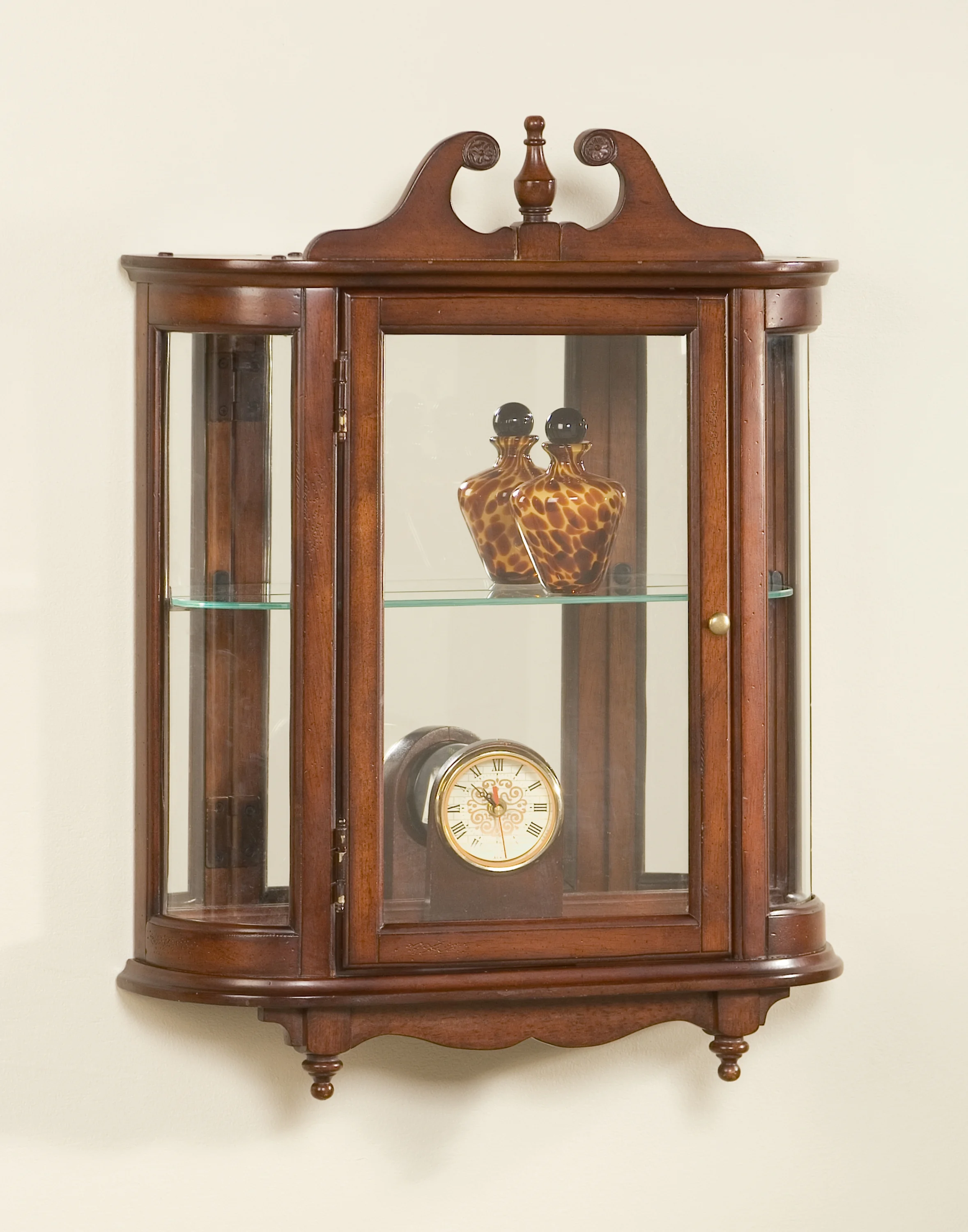 moreThis distinctive wall curio is both functional and beautiful with two adjustable glass shelves and a mirrored back to display your prized possessions. The curved glass sides make it very unique. The glass paneled door features antique brass finished hardware. This future heirloom is made of select solid woods and wood veneers.