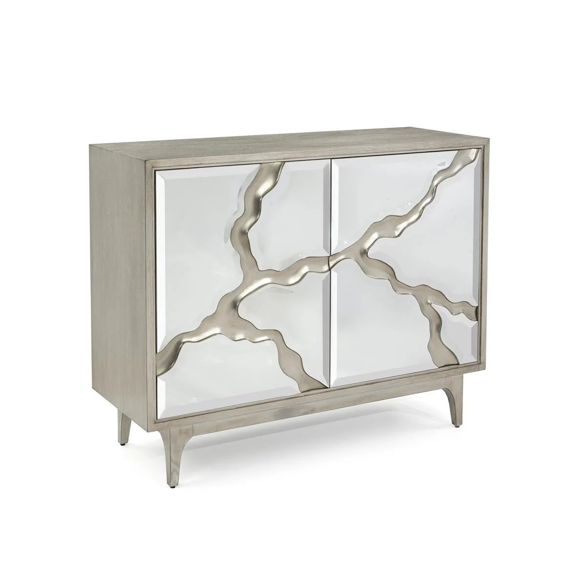 moreRevne Two-Door Silver Chest features modern beveled mirror fronts with an inset ravine pattern in a silver finish. The Chest and base are finished in silver leafed oak.