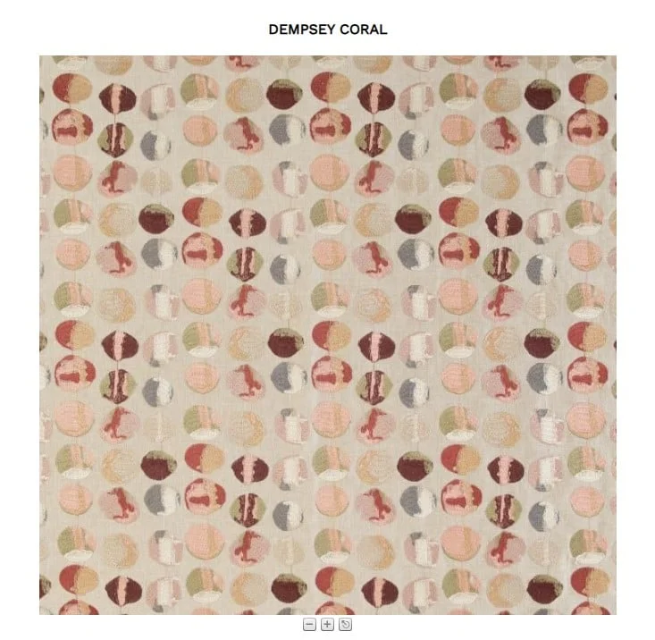 - FABRIC NAME: C-JUBILEE DOLPHIN CONTENT: 100% POLYESTER FABRIC NAME: DEMPSEY CORAL CONTENT: 52% POLYESTER 48% COTTON