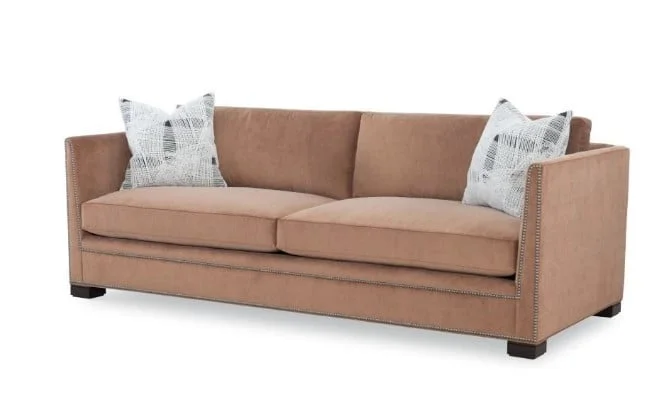 Thorpe Sofa in body fabric C-Jubilee Dolphin and contrasting throw pillows in Dempsey Coral fabric.