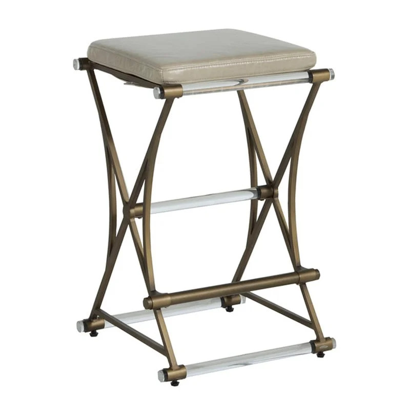 - A brushed brass X shaped base combines with reflective acrylic accents and a luscious light gray leather seat cushion to shape the sleek modern style of the Flynn Counter Stool.