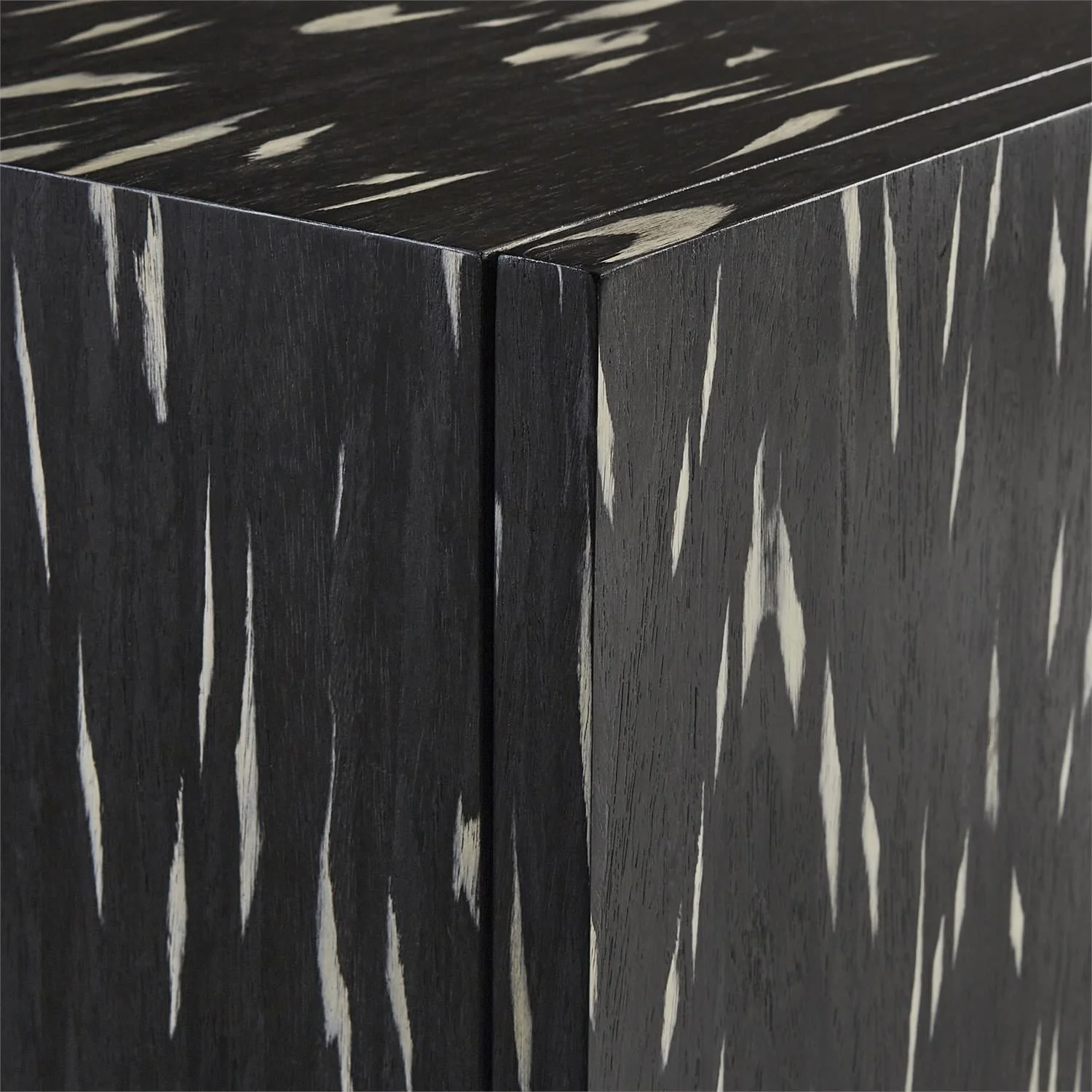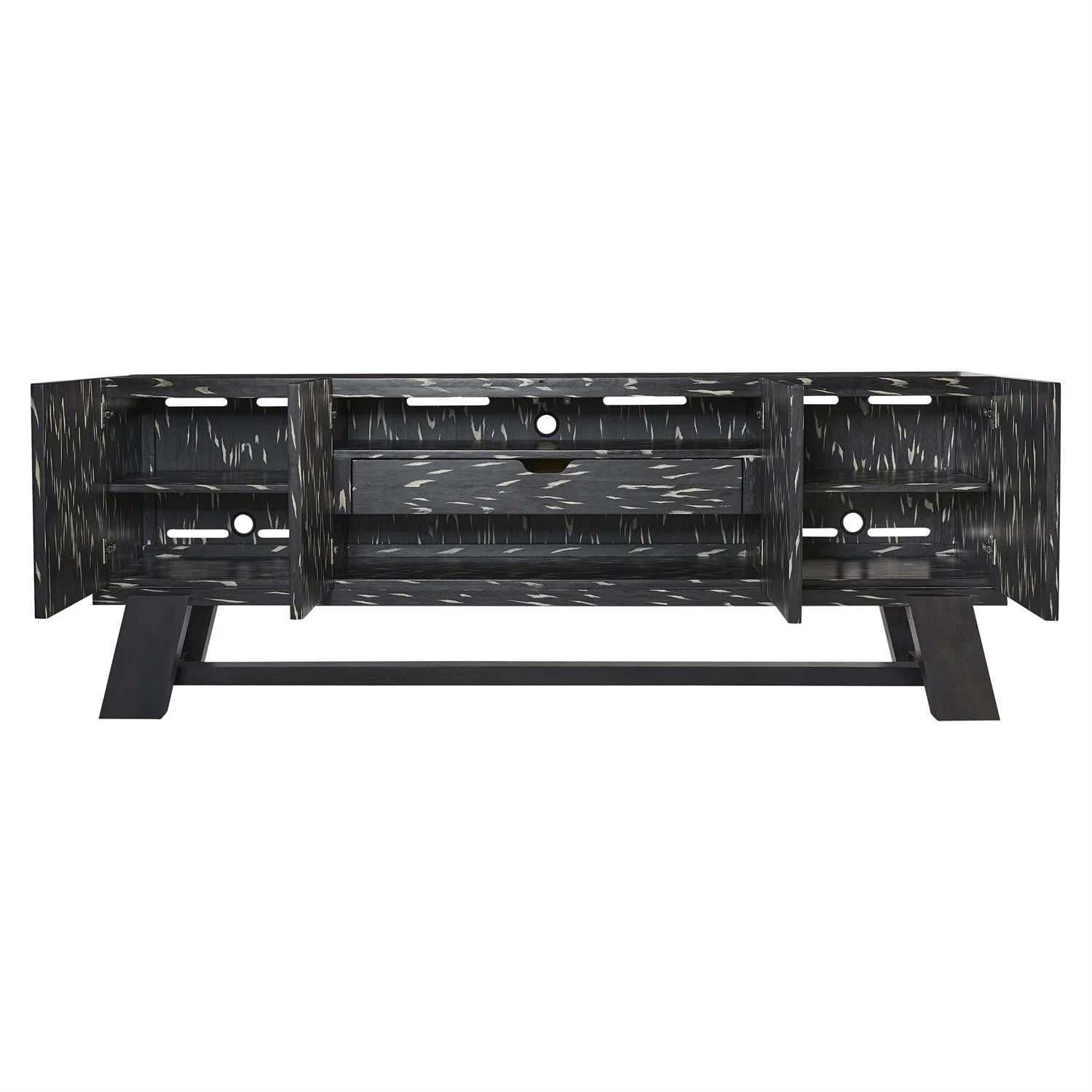 moreDrama created with simple lines and a bold finish that draws all eyes, this entertainment credenza will be the star of the show with its stunningly artistic Engineered Contrast Ebony finish. The case offers four push-to-open doors that easily store any entertainment or gaming equipment, and is supported by four black diagonal legs joined by horizontal and vertical stretchers.