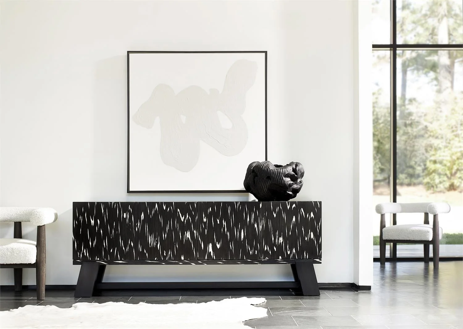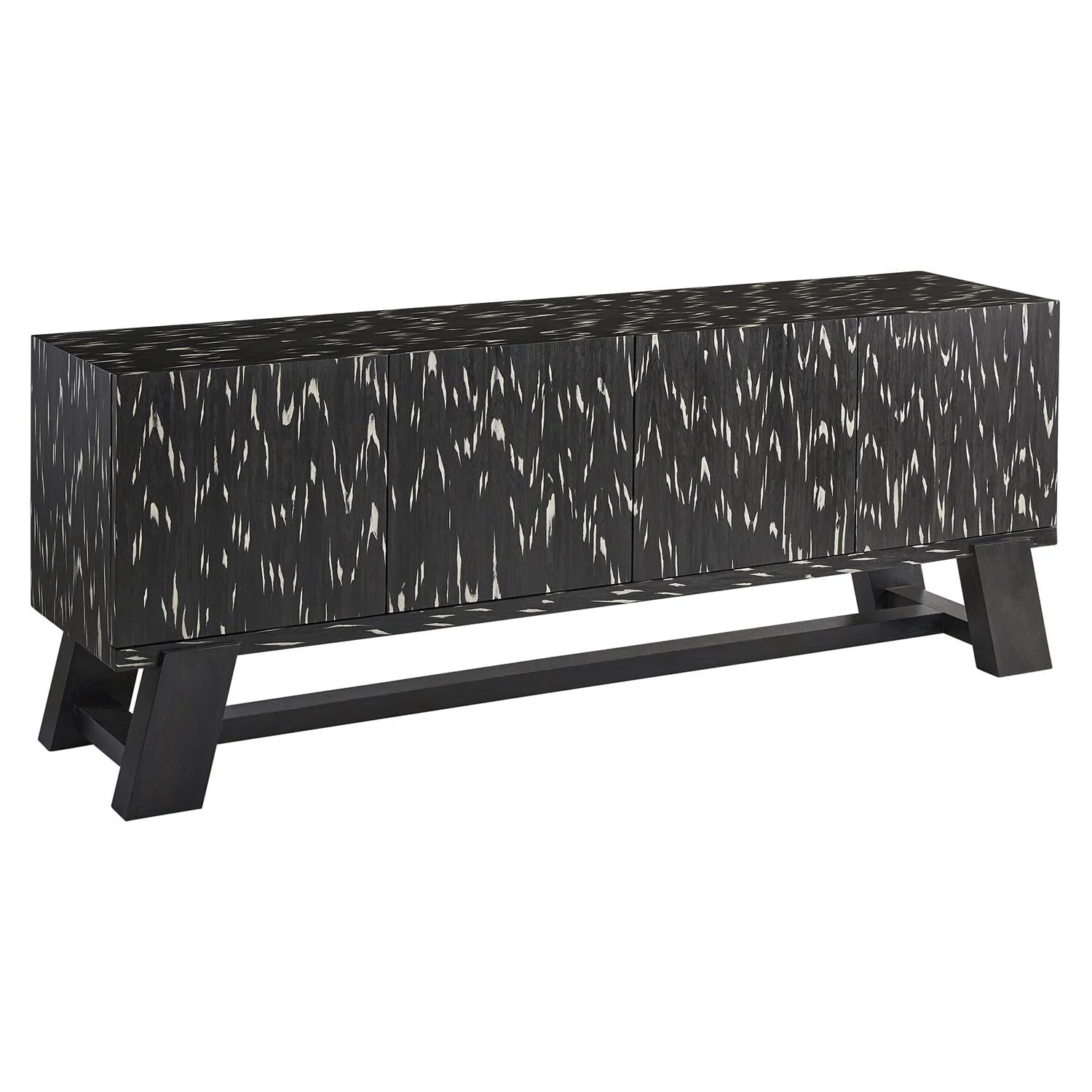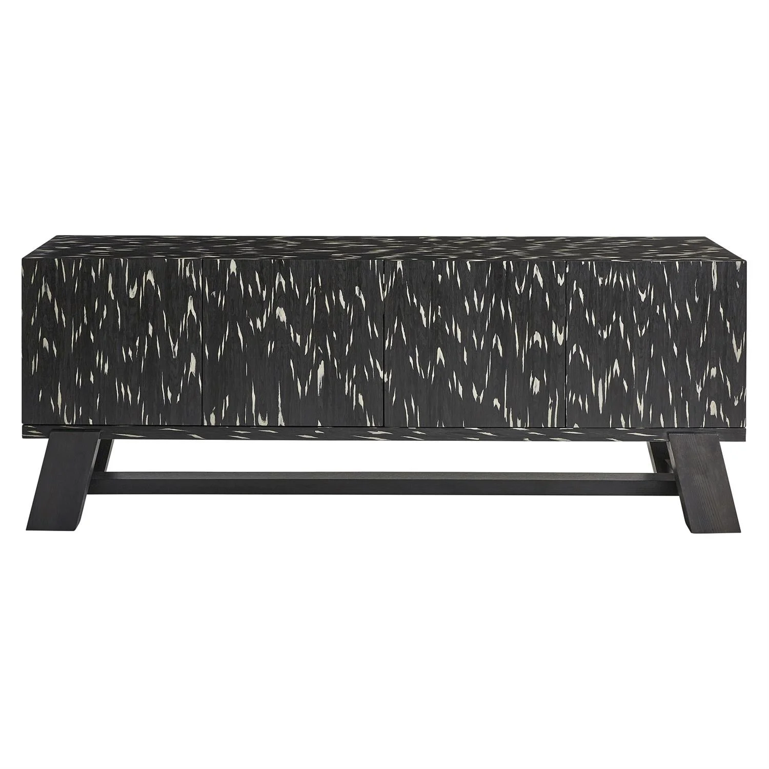 Entertainment credenza crafted with flat-cut yellow pine & ash solids & engineered veneers in L'Ombre and striking Engineered Contrast Ebony finishes.
