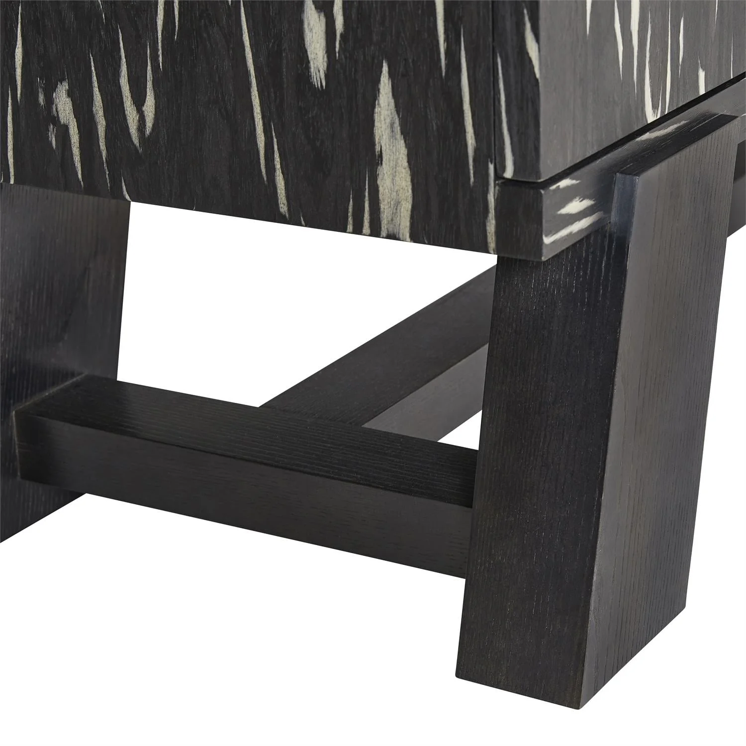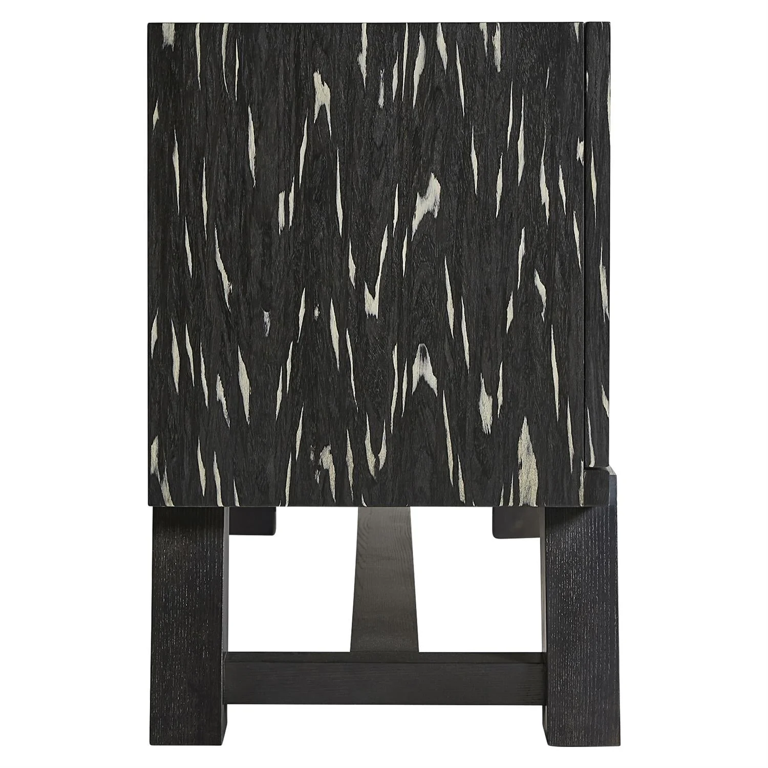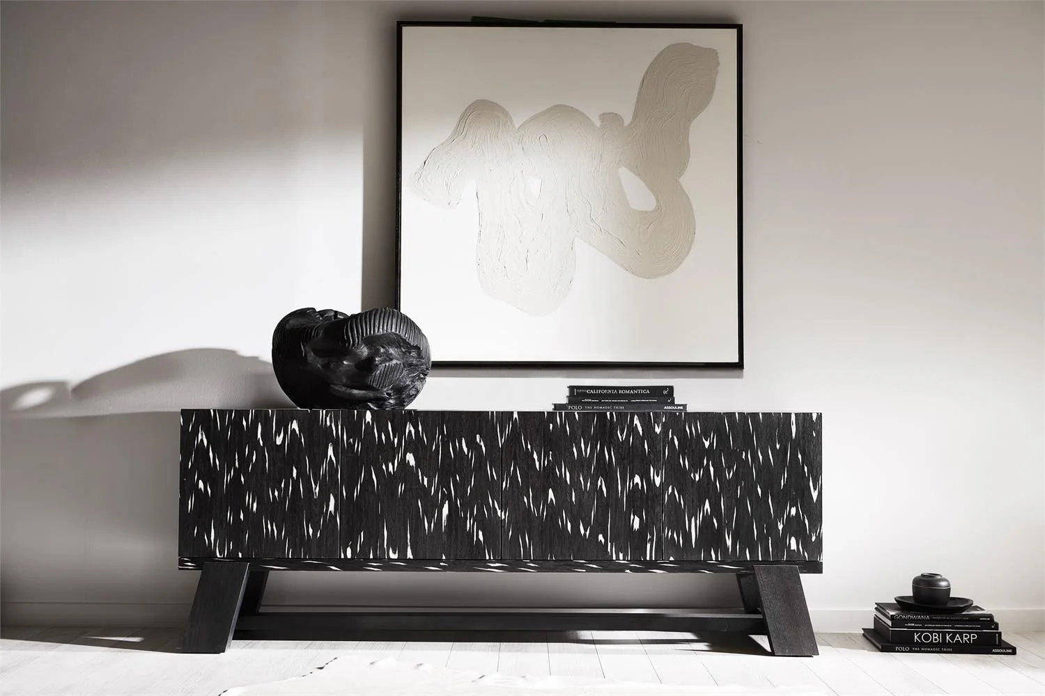 Entertainment credenza crafted with flat-cut yellow pine & ash solids & engineered veneers in L'Ombre and striking Engineered Contrast Ebony finishes.
