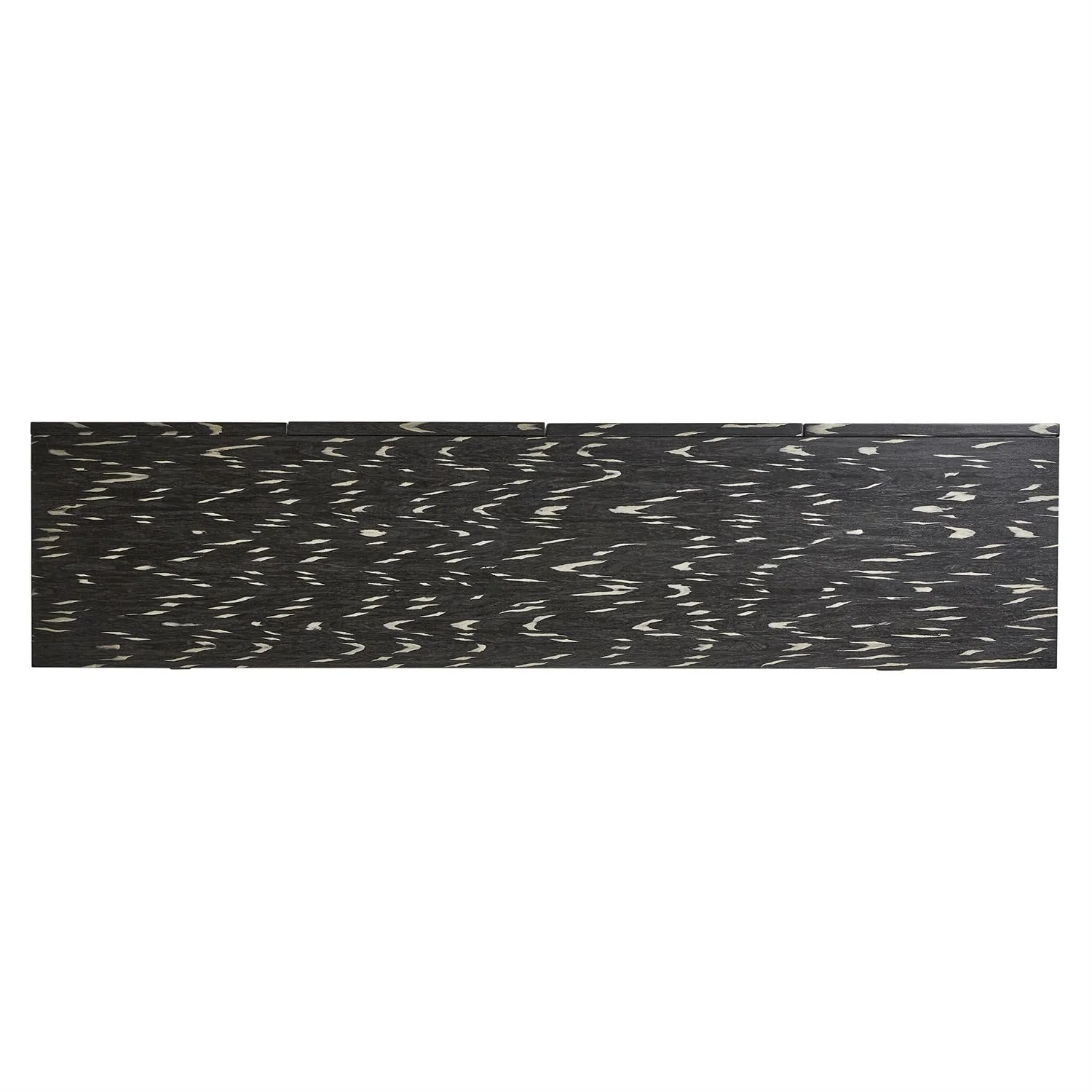 - -Entertainment credenza crafted with flat-cut yellow pine & ash solids & engineered veneers in L'Ombre and striking Engineered Contrast Ebony finishes -Engineered Contrast Ebony on fully finished inside