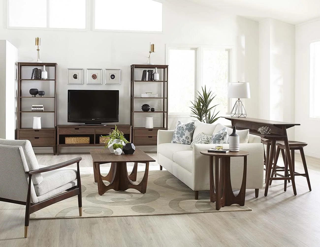 Inspired by mid-century modern style, the Walnut Grove Bookcase features beautifully rounded walnut supports holding three floating and one stationary shelf. In addition to more than ten feet of display area, it also offers two drawers for storage.